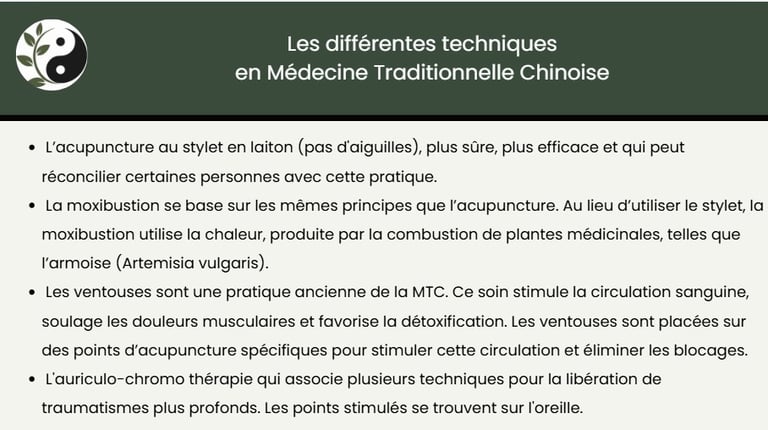 Il est important de préciser que la Médecine Traditionnelle Chinoise ne se substitue pas à la médecine occidentale. Elle n'est pas contradictoire, elle est complémentaire.